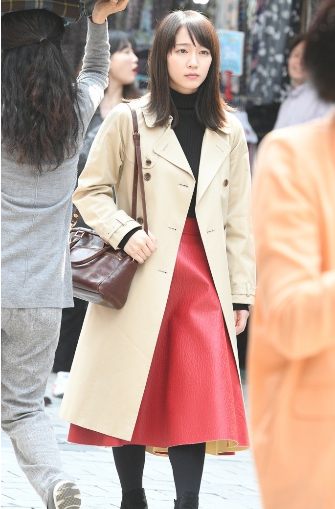 吉岡里帆(エーチーム所属) トレンチコート×レディな 赤スカートがドラマチック
